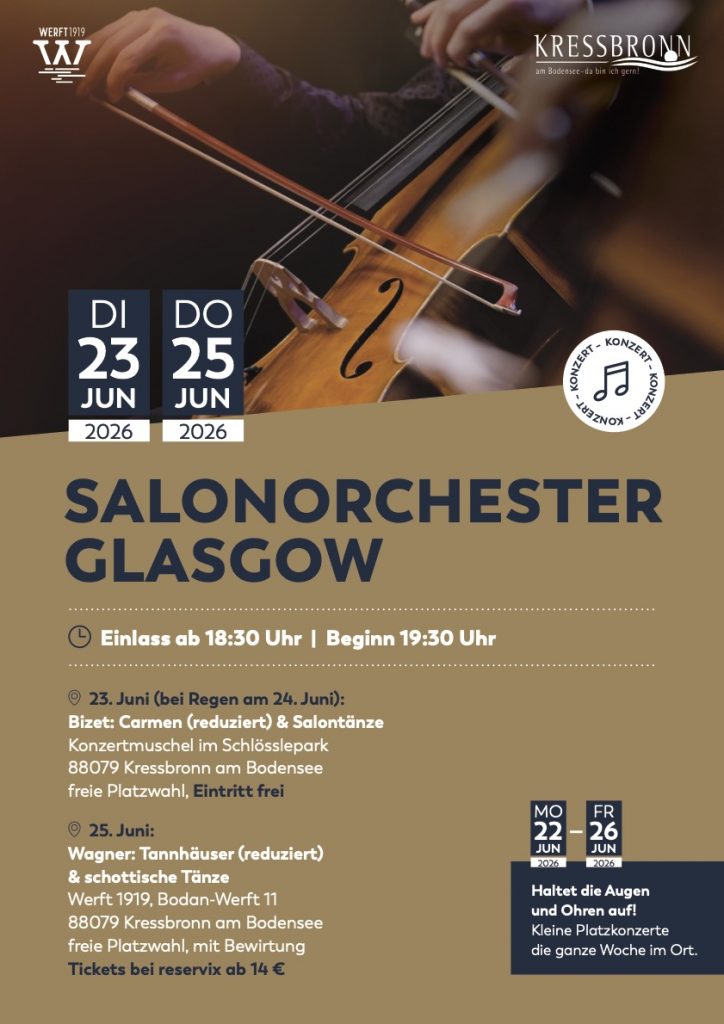 ENGLISH: The Glasgow Salon Orchestra will visit Kressbronn from June 22nd to 25th, 2026. Three famous operas will be performed in entertaining short versions: Bizet’s Carmen, Wagner’s Tannhäuser, and Donizetti’s Lucia di Lammermoor (a romantic melodrama set in Scotland).